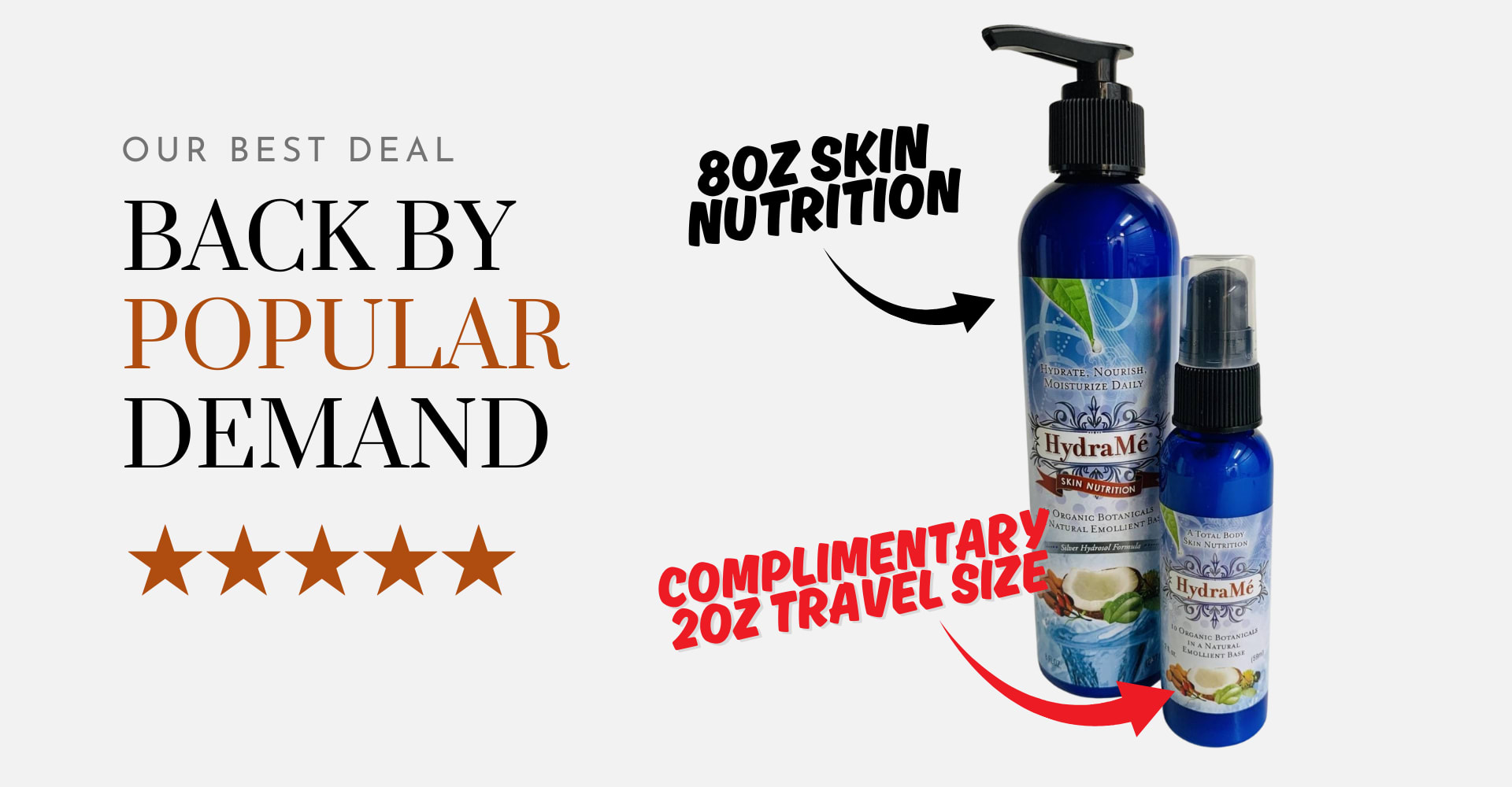 Purchase the 8oz Skin Nutrition today and receive a complimentary 2oz travel size, so your skin stays nourished wherever life takes you.